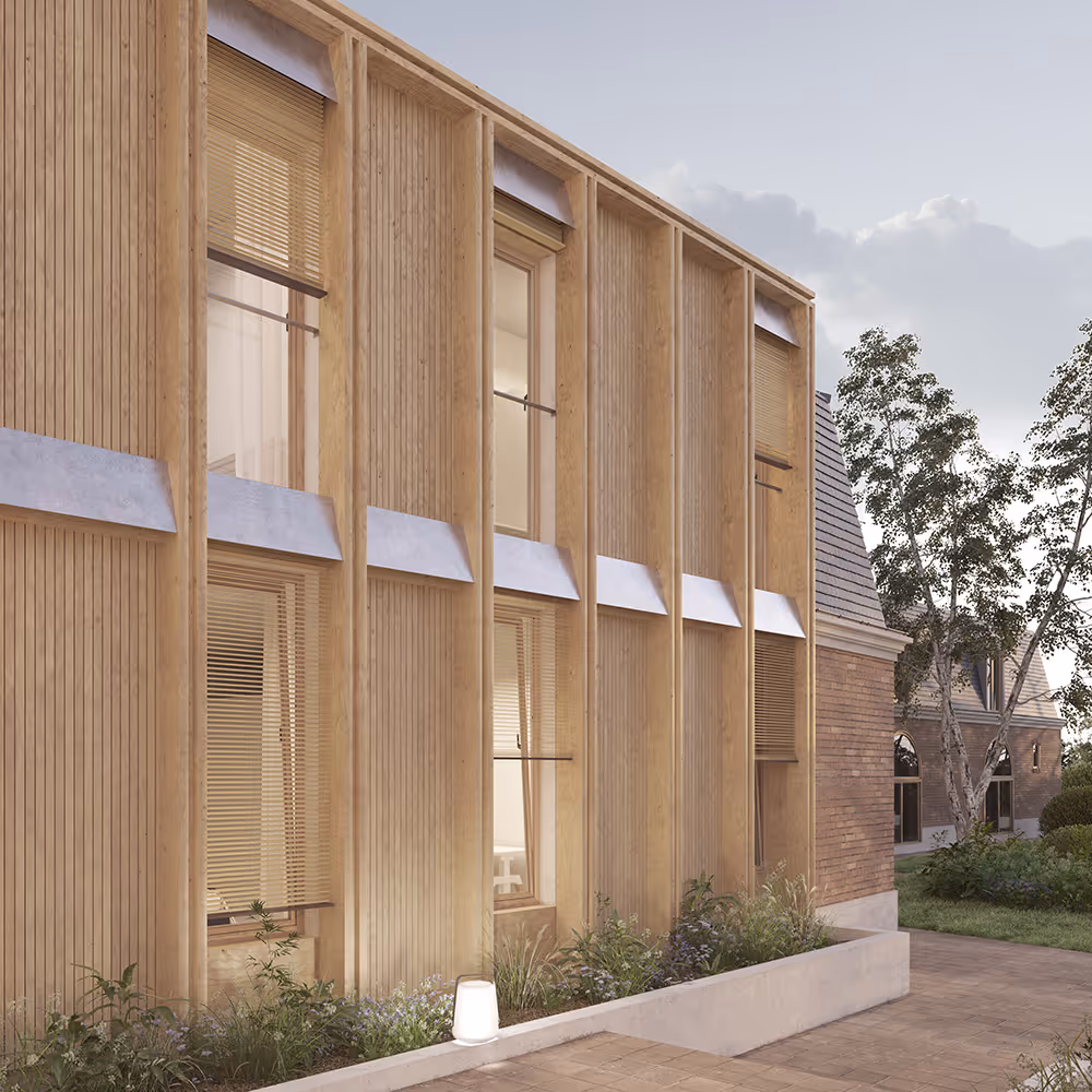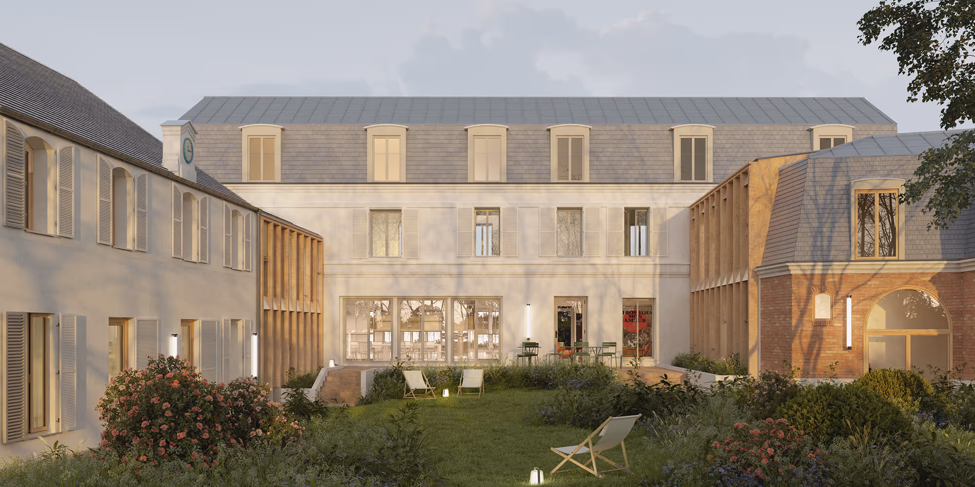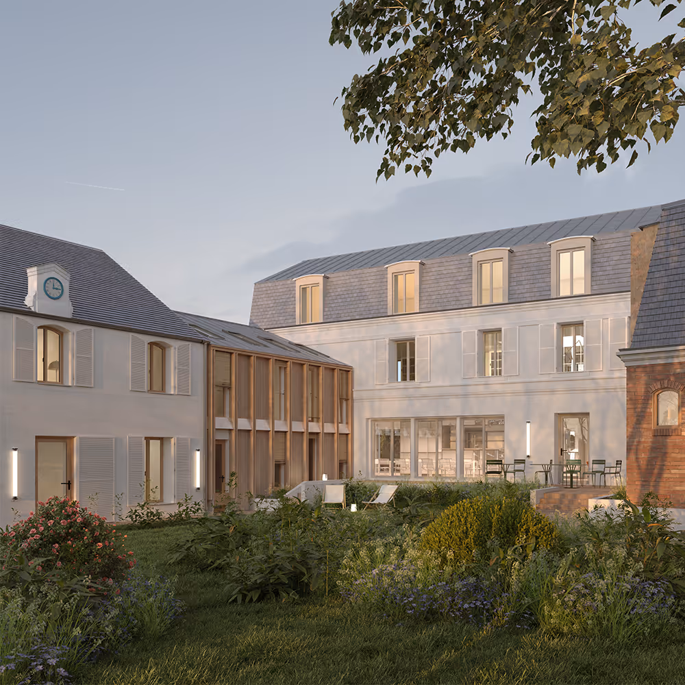 Situé au coeur historique de Marly-le-Roi, dans un ancien hôtel particulier du XVIIe siècle aujourd’hui inoccupé, le projet prévoit la réhabilitation du bâtiment principal, de ses deux annexes, ainsi que la création de deux extensions en dents creuses. Ces greffes relient les volumes existants et permettent d’accueillir 20 logements à destination de familles monoparentales. Les nouvelles constructions s’ouvrent sur un coeur d’îlot végétalisé et se distinguent par des façades à ossature bois et des menuiseries bois. Les matériaux intérieurs sont biosourcés, notamment le béton de chanvre. La préfabrication a été privilégiée pour répondre aux contraintes d’accès et limiter les nuisances. Une trame constructive simple et répétitive optimise les coûts et facilite la mise en oeuvre.