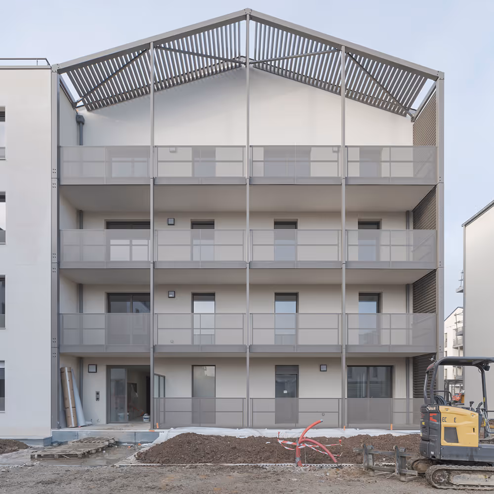 Le projet s’organise autour de deux bâtiments séparés par une faille piétonne paysagère, traversant la parcelle et favorisant les mobilités douces. Il développe deux volumétries : un R+3 avec attique en retrait, assurant une transition urbaine douce, et un R+3 à toitures en pente, évoquant une échelle domestique.